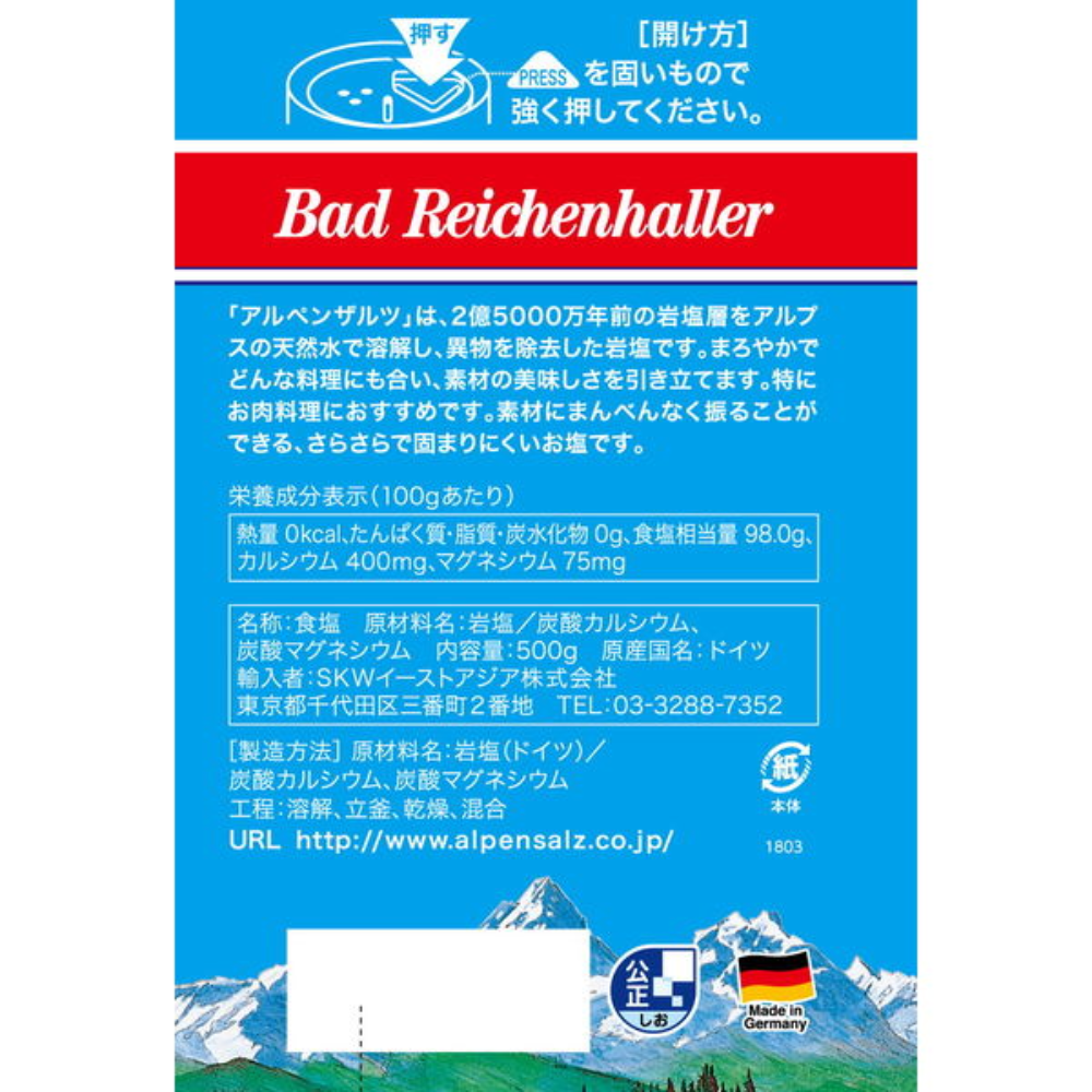 "Alpen Salz" is rock salt made by dissolving 250 million year old rock salt layers with natural Alpine water and removing foreign substances.
