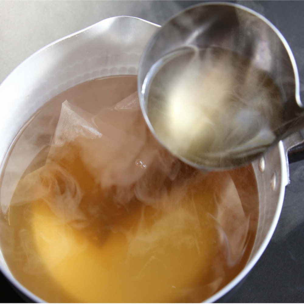 This teabag-style dashi is a premium blend of five ingredients, including carefully aged Kagoshima bonito flakes, roasted flying fish, and kelp. It offers the authentic taste of Japanese cuisine with ease and convenience. Made to bring out the natural umami of the ingredients, it enhances the flavor and richness of any dish—combining both simplicity and exceptional taste.